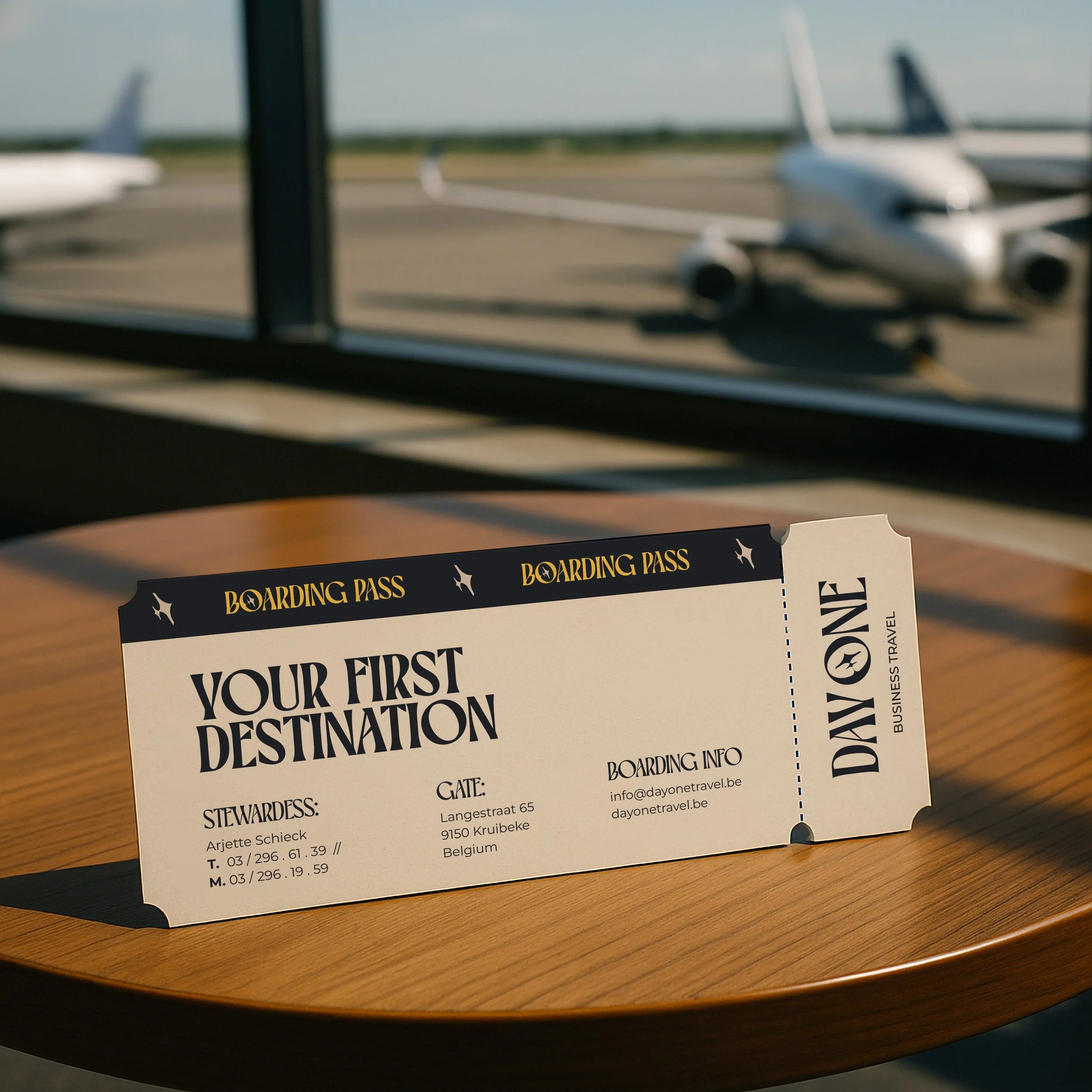 Day One Travel positioneert zich als een betrouwbare partner voor zakelijke reizen, met een sterke focus op efficiëntie, duidelijkheid en persoonlijk contact. Het designtraject vertrok vanuit de behoefte aan één heldere merkuitstraling die deze waarden onmiddellijk communiceert, zowel inhoudelijk als visueel.